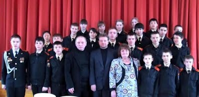 Петровский кадетский корпус. Москва. САО. Открытый урок против наркотиков. На фото - организатор Единой недели против наркотиков в Кадетских корпусах САО Москвы подполковник полиции А.А.Глахов  и ведущий цикла Открытых уроков против наркотиков председатель НСНБР А.Г.Огнивцев с учащимися и преподавателями Петровского кадетского корпуса.